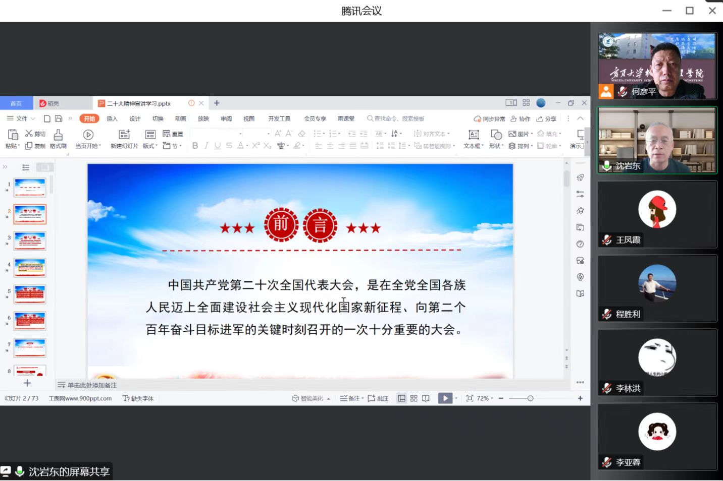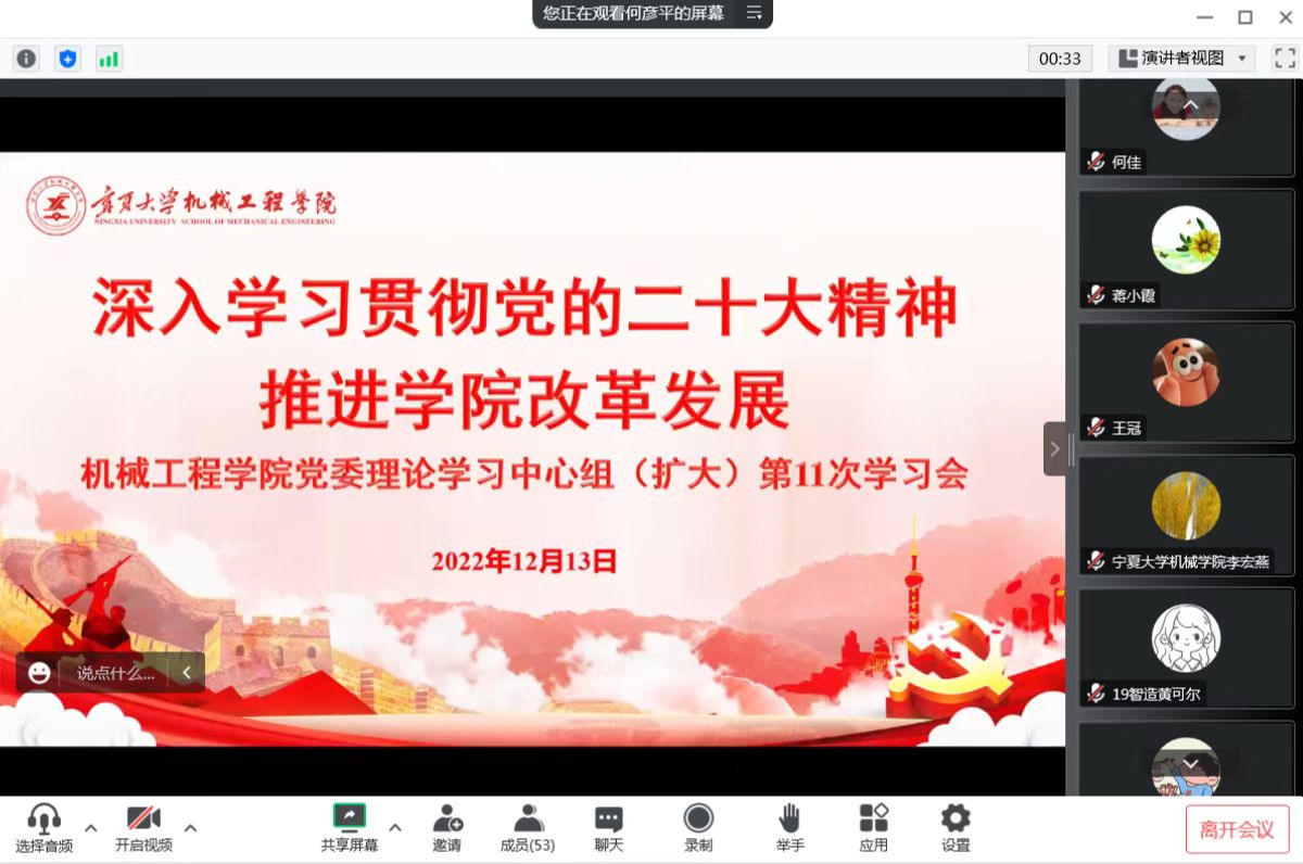 12月13日,我院线上组织召开2022年院党委理论学习中心组(扩大)第十一次学习会,邀请宁夏大学党的二十大精神巡回宣讲团成员、马克思主义学院教师沈岩东作“党的二十大精神宣传学习”专题辅导报告,进一步深入学习贯彻党的二十大精神。院党委书记程胜利主持会议。