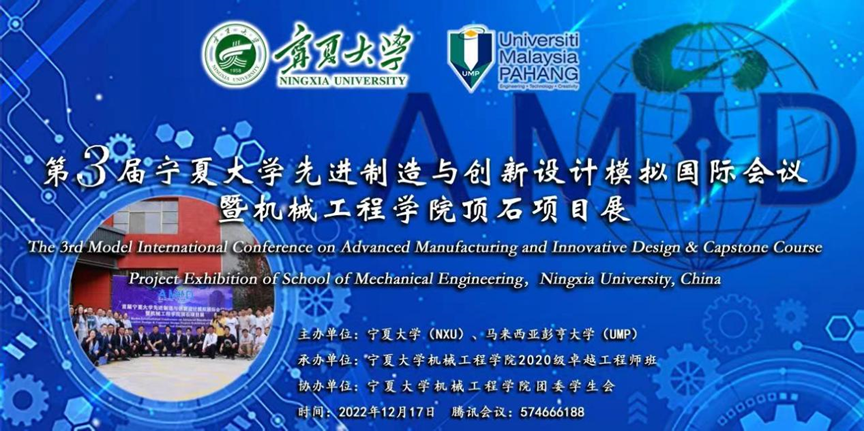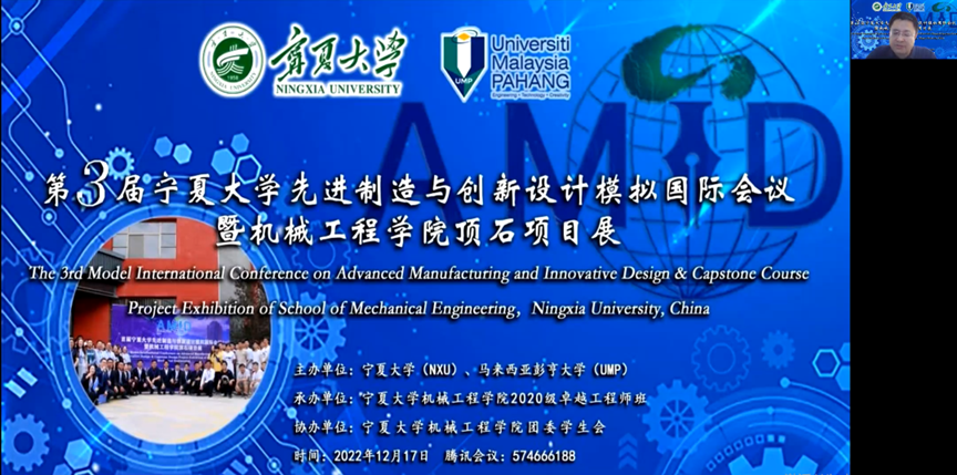 2022年12月17日,我院线上举行了第三届宁夏大学先进制造与创新设计模拟国际会议暨金沙集团1862cc顶石项目展(The 3rd Model International Conference on Advanced Manufacturing and Innovative Design)。学院执行院长张波、马来西亚彭亨大学学术合作战略中心主任Mohd Ruzaimi Bin Mat Rejab出席会议,学院多名青年教师、彭亨大学博士生马全锦和Nur Khaleeda Binti Romli、马来亚大学硕士研究生孙博等人作为专家、评委和特邀报告者参加会议。会议由我院2020级卓越工程师班承办,2020级机械工程(卓越工程师)班学生王志坤和彭祖琳主持开幕式和特邀报告。学院本科生和研究生线上踊跃参与会议。