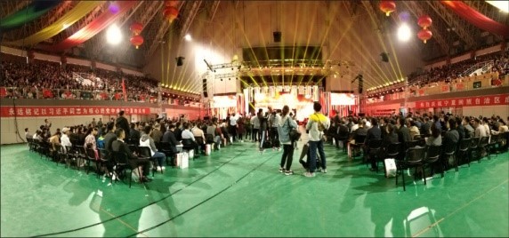 八点半时大学生活动中心召开校庆庆典祝贺宁大、展望宁大。会场上,校友齐聚一堂,热泪盈眶,共述旧情,回忆过往校园生活,场面十分温馨。随后安排了校庆专场文艺演出,一段宁夏说唱,一场军训故事,一段六盘山上的我们,再绘宁夏百草黄云、百卉千葩;一袭追梦青春,再绘匆匆岁月、奋斗不息,歌谣悠扬,缭绕不绝。校园之歌,勤学之歌,求是之歌,歌歌入耳。老中青三代共同合作,亲如一家,展现宁大人风采。检校园花为日课,裒寻诗昔计年劳。60周年见证了宁大的翻然改进,日新月异,一歌一舞,舞出了新宁大。会场上表演令人心潮澎湃,观众积极响应,彩旗飘扬,舞美绚丽,掌声不断。