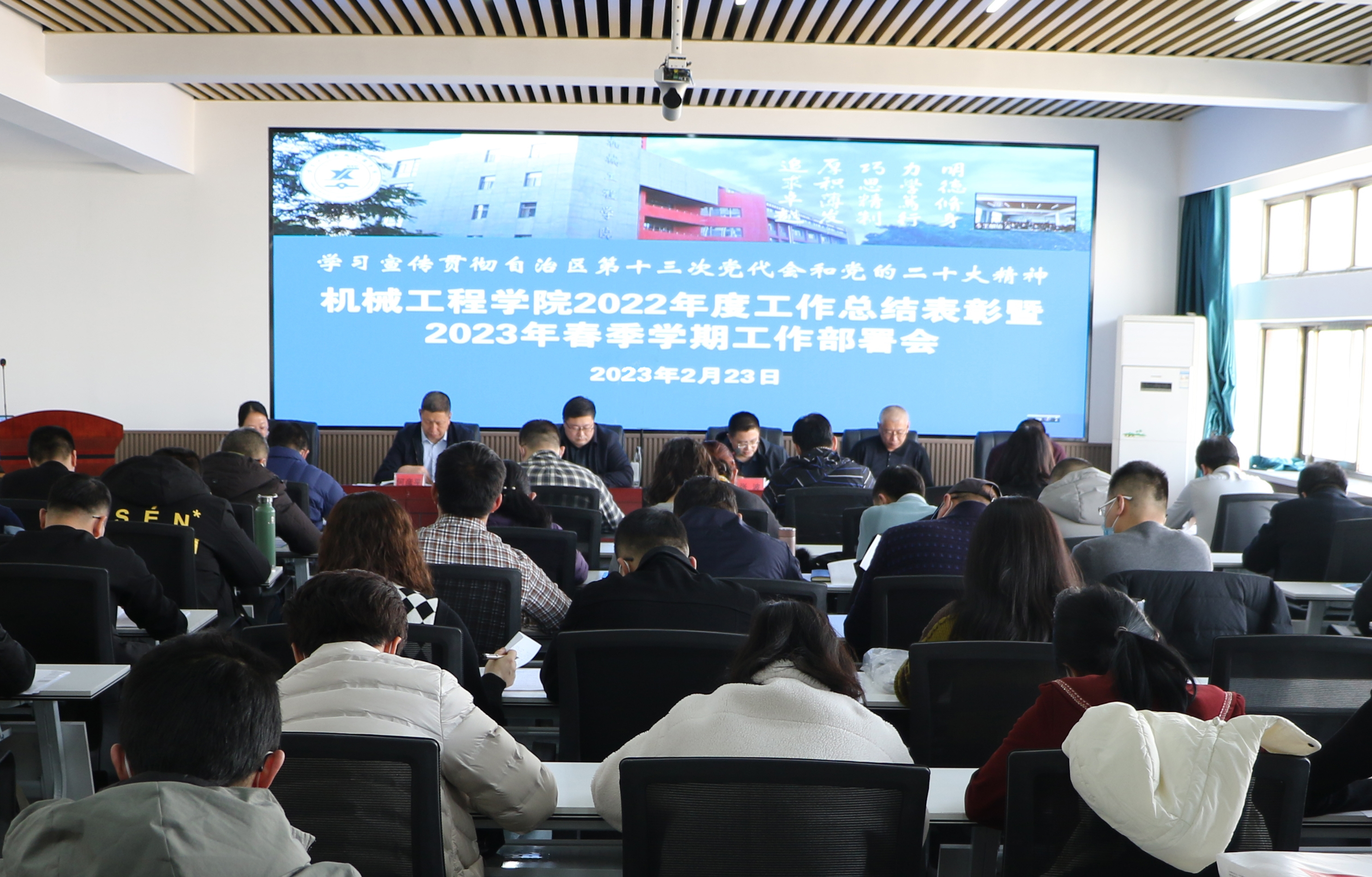 程胜利在总结讲话中讲到,学院将切实把思想和行动统一到深入学习宣传贯彻习近平新时代中国特色社会主义思想和党的二十大精神及自治区第十三次党代会精神上来,在全面学习、全面把握、全面落实上下功夫,把学习贯彻落实习近平新时代中国特色社会主义思想作为根本,贯穿实践,指导工作,推动党的二十大精神在全院落地生根、开花结果。他希望全院教职工面对学校综合改革,要凝聚力量上下齐心,瞄准目标任务,按照学院各项工作部署要求和2023年重点工作,扎实推进各项工作取得实效,全力推动学院各项事业取得新突破。