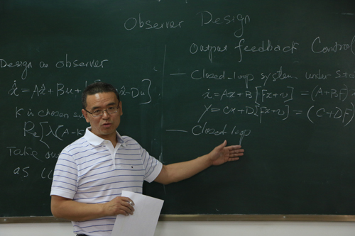 课程“现代控制理论”示范教学分别在金沙集团1862cc的512和518会议室进行,金沙集团1862cc杨术明副院长主持,金沙集团1862cc研究生和部分老师参加。陈文教授讲授了2个学时的现代控制理论发展现状和4个学时的控制观测器设计应用。教学环节采用全板书形式,推导详尽、条理清楚。学生和老师的积极互动交流,让研究生近距离感受了美国大学教授和教学方式。