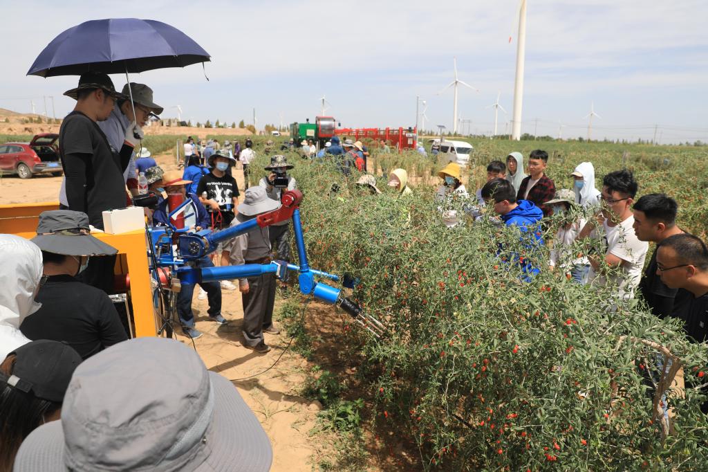 在中杞集团天景山基地,验收专家组通过实地查看、听取介绍、现场演示和录像等形式,对手持便携式采摘器、精准振动式采收装备、多臂协同式机器人采收装备和气振复合式枸杞采收装备的工作原理、技术创新、进展情况、存在的问题等方面进行了详细了解。