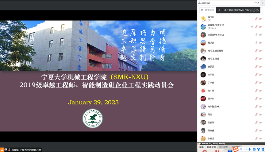 根据学院本科人才培养方案,2019级卓越工程师与智能制造班学生将于2月6日进入到企业开展为期四个月的企业工程实践。1月29日,金沙集团1862cc线上召开企业工程实践动员会,学院执行院长张波、党委副书记何彦平、副院长王昱潭、李宏燕、郝洪涛以及来自吴忠仪表、青岛海尔、浙江杭可、共享集团等企业负责人、校企指导教师和实践实习学生共80余人参加会议。