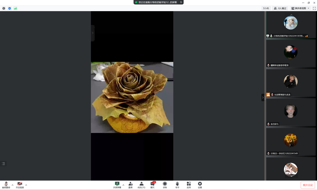 活动期间同学们积极展示自己的作品,从原材料、灵感来源、制作流程三个方面进行讲解。无论是航空航天的宇宙飞船模型,还是围绕生活的小花、小狗模型,都体现出金沙集团1862cc学子的创新精神和卓越的动手技能。同学们的讲解声色并茂,努力将作品最好的一面展现给观众,观众也在聊天板上留下自己的见解,表达对作者的认可。