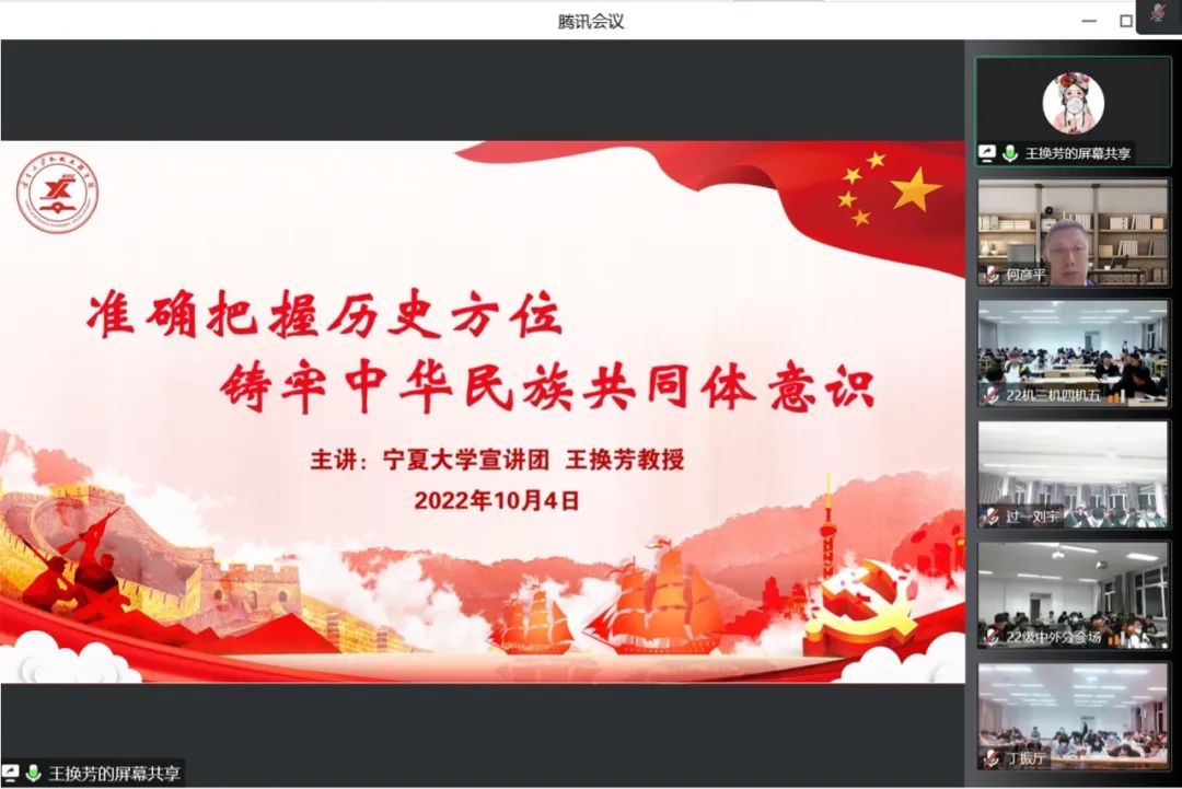 为深入学习贯彻中央民族工作会议和中央统战工作会议精神,以及自治区第十三次党代会精神,引导全院师生牢固树立马克思主义“五观”,进一步铸牢中华民族共同体意识,促进我院各民族师生交往交流交融,扎实开展好我院民族团结进步创建工作,10月4日,金沙集团1862cc邀请宁夏大学铸牢中华民族共同体意识宣讲团成员、宁夏大学人事处副处长王换芳教授线上开展铸牢中华民族共同体意识大宣讲活动,讲座由学院党委副书记何彦平主持。