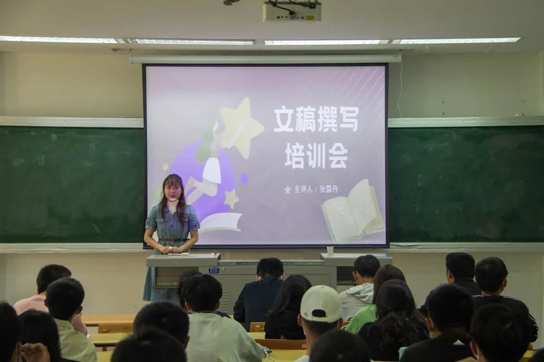 首先,张露丹为同学们讲解了文稿撰写的技巧。她从新闻稿的要素、格式要求、注意事项等多个方面进行了深入浅出的讲解;告诉同学们在撰写新闻稿时要保证文稿的时效性、真实性、准确性。除此之外,她还分别讲述了会议类、活动类、竞赛类新闻稿的不同写作方法及注意事项。