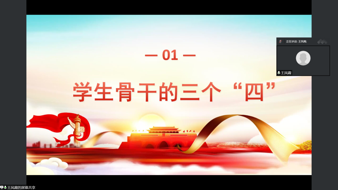 王凤霞从学生骨干应做到的三个“四”、“疫情下的青年人故事”以及“如何成为一名合格的学生骨干”三个方面为同学们讲解了学生骨干应有的责任与担当。