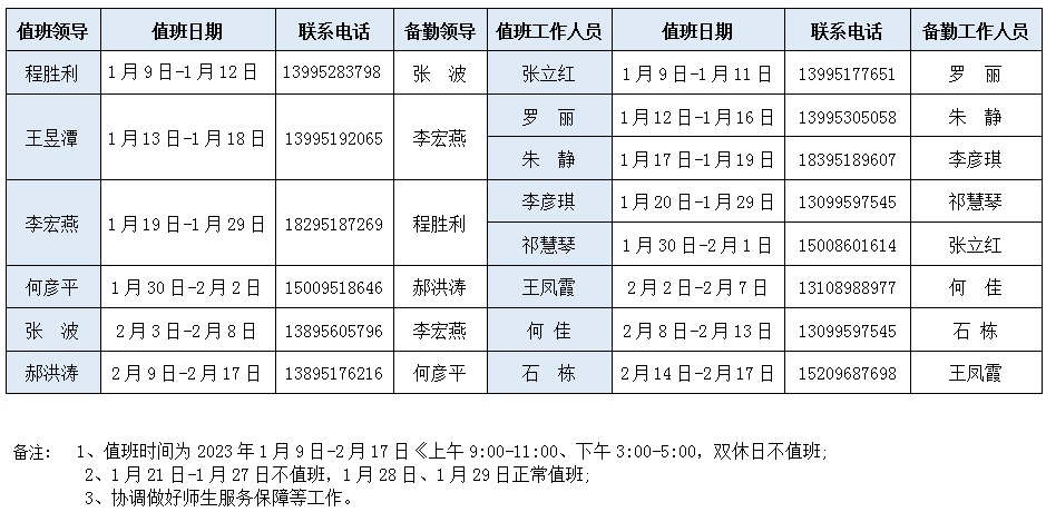 金沙集团1862cc2023年寒假值班表