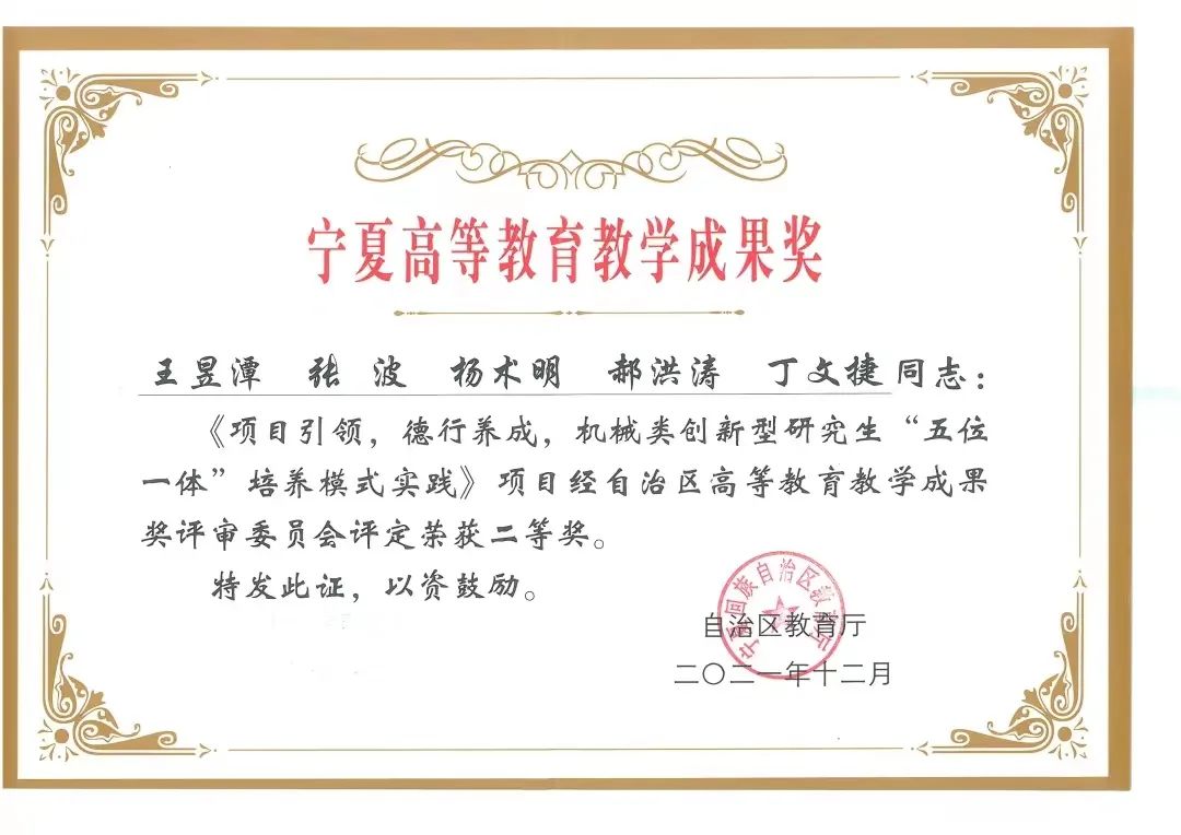 近年来,金沙集团1862cc在人才培养与学科建设方面取得丰硕成果。2015年“机械工程”专业获批自治区“十三五”重点建设专业,是宁夏大学首个教育部卓越工程师教育培养计划试点本科专业,2017年入选宁夏大学“西部一流专业”建设群。“机械工程”于2017年被自治区人民政府确定为“西部一流”重点建设学科。2020年1月“机械工程”专业入选首批国家级一流本科专业建设点,“过程装备与控制工程”专业入选自治区一流本科专业建设点。2018年以来,学院获国家级教学成果二等奖1项、宁夏高等教育自治区级教学成果特等奖2项、一等奖2项、二等奖1项。