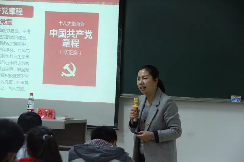 白雪梅书记以“党章知识学习交流和分享”为主题,从学习十九大党章,党章概述,党章总纲,党章条文四个方面进行讲授。白书记强调,我们要学会对照党章党规,找问题,找差距,进行自我检视,自我反思。