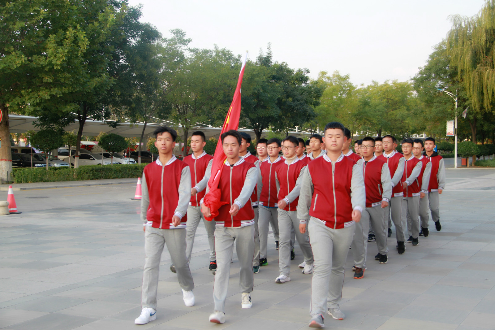 随着清晨第一缕阳光的升起,升旗仪式正式开始,金沙集团1862cc27名学生组成的国旗护卫队,精神饱满,迈着整齐划一,铿锵有力的步伐护送国旗至旗台下,全场气氛庄严而肃穆,随着五星红旗冉冉升起,在场师生高唱国歌,行注目礼。