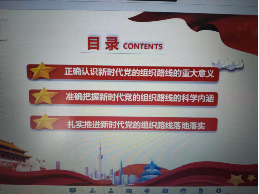 李书记从党的组织路线的意义、科学内涵以及落地落实三个方面讲解,尤其结合学校、学院实际,分享了自己对党的组织路线的理解,并要求各位支部委员抓紧自己本职工作,更好理解党的组织路线。