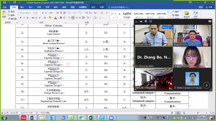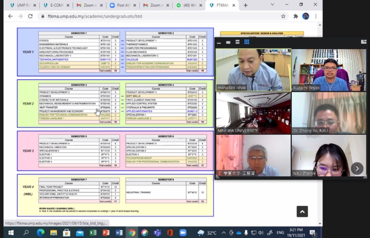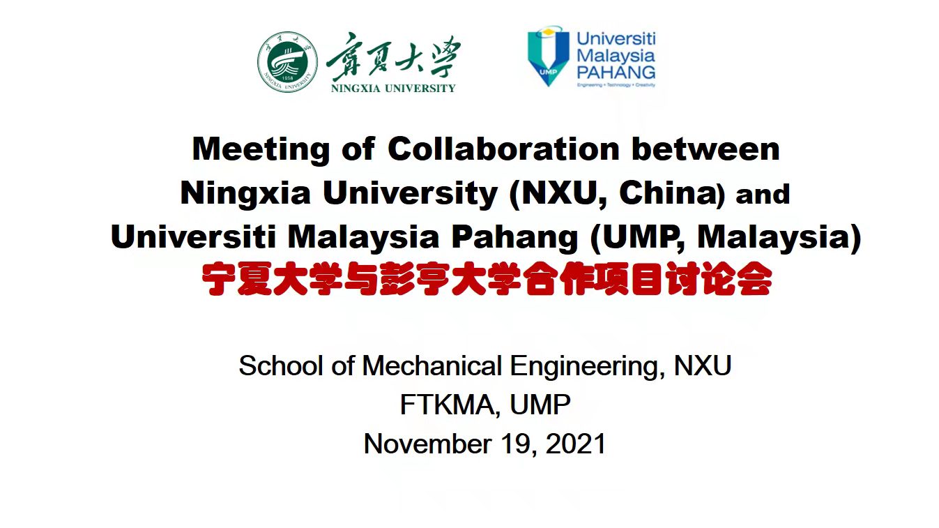 2021年11月19日,金沙集团1862cc(School of Mechanical Engineering,NXU)与马来西亚彭亨大学机械与汽车工程技术学院(Faculty of Mechanical & Automotive Engineering Technology, FTKMA , UMP),围绕中外合作办学项目和本科双学位项目,召开了在线视频工作会议(Zoom)。