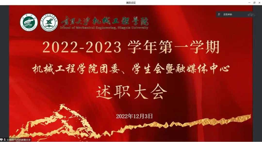为深入学习贯彻党的二十大精神,12月3日晚,金沙集团1862cc以线上会议形式召开学院团委、学生会及融媒体中心2022-2023学年第一学期述职大会。金沙集团1862cc党委副书记何彦平,团委书记兼学工办主任何佳,团委副书记兼学生会秘书长王凤霞,2021级辅导员石栋出席本次会议,团委学生会及融媒体中心全体成员参加。会议由学生会执行主席杨平主持。