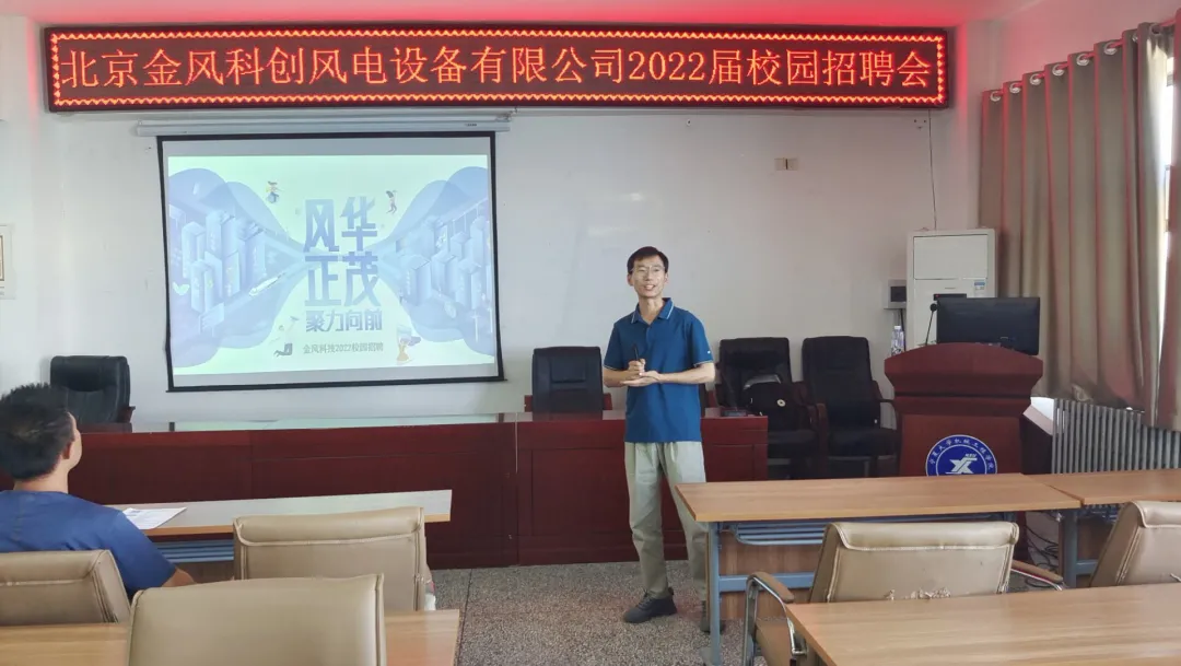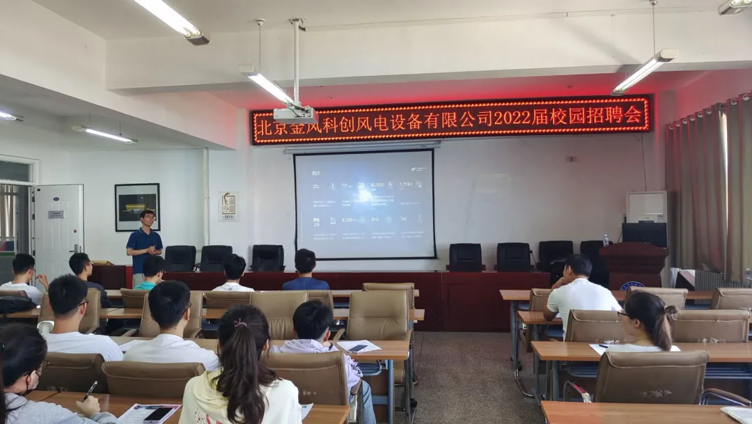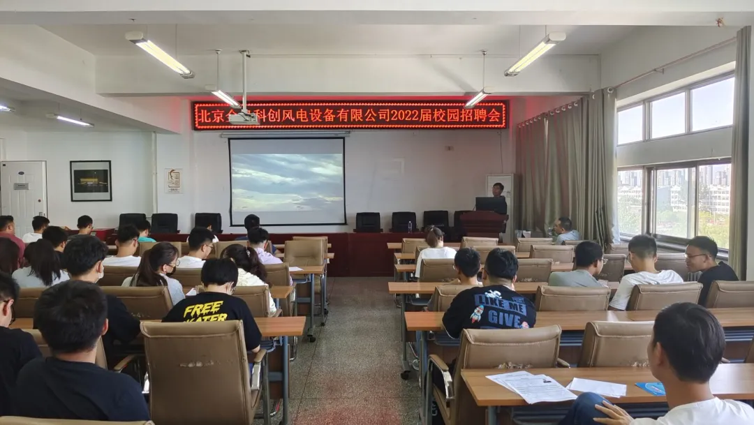 9月23日,北京金风科创风电设备有限公司在明远楼512室举行2022届校园招聘会,此次招聘会面向金沙集团1862cc2022届毕业生以及其他有意愿的学生,同学们积极响应,共70余人到场。